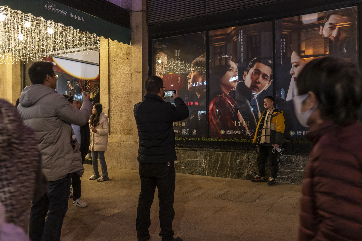 Visitors take photographs in front of posters of the TV show Blossoms Shanghai at the Peace Hotel, in Shanghai, China, on Friday, Jan. 12, 2024. Director Wong Kar-wai's First TV Series 'Blossoms Shanghai' evokes memories of a more open and optimistic period in China.