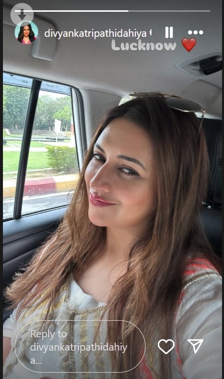 On her Instagram stories, Divyanka Tripathi posted a lovely picture of herself sitting inside her car as she stepped into the city of Nawabs – Lucknow. She was seen flaunting her lovely smile while clicking the selfie. Dressed in a traditional attire that included an ivory-hued kurta layered with a multi-coloured sleeveless jacket, the actress exuded radiance. She kept her makeup subtle and opted for blushed cheeks, thin strokes of eyeliner and glossy pink-tinted lips. Middle-parted, straight-open tresses finished off her look for the day. Atop the snap, she penned, “Lucknow," followed by a red heart revealing her lovely mood.